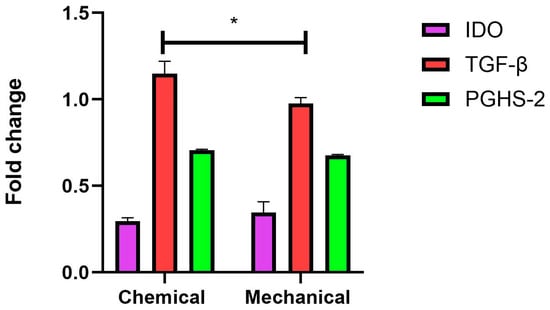 Fold change in expression of IDO, TGF-β, and PGHS-2 under chemical and mechanical methods. The findings demonstrate the relative expression levels of three markers across two experimental conditions. Under chemical conditions, TGF-β shows the highest expression, followed by PGHS-2 and IDO with the lowest expression. Under mechanical conditions, TGF-β remains the most expressed marker, although slightly lower, with PGHS-2 and IDO showing similar trends. Values are presented as mean ± SEM (n = 3). Statistical significance is indicated as * p < 0.05.
