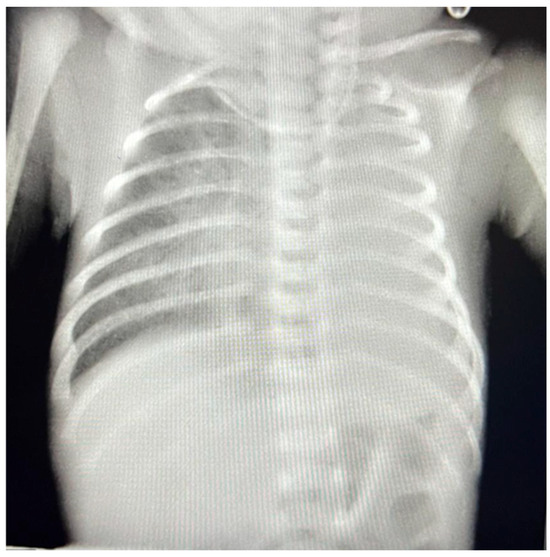 We present the case of a 6-day-old male transferred to our institute from a tertiary center with the diagnosis of severe aortic coarctation and respiratory failure. The patient was born via cesarean section at a gestational age of 38 weeks with an Apgar score of 8 at birth. In the family history, it is noteworthy that the patient’s mother had thrombophilia. At birth, the patient’s SpO2 remained below 90%, prompting the initiation of free-flow oxygen therapy. At 1 h of life, the patient developed signs of respiratory distress syndrome, with SpO2 levels between 88–92%, leading to the initiation of non-invasive ventilation via BCPAP (flow 7 L/min, PEEP 7.5 cmH2O, FiO2 25–45%), which achieved SpO2 levels of 90–94%. Serial chest X-rays revealed heterogeneous opacification of the entire left pulmonary field with a retractile effect on adjacent structures (Figure 1). An initial transthoracic echocardiography (TTE) revealed severe aortic coarctation and a patent ductus arteriosus (PDA) with bidirectional shunting.