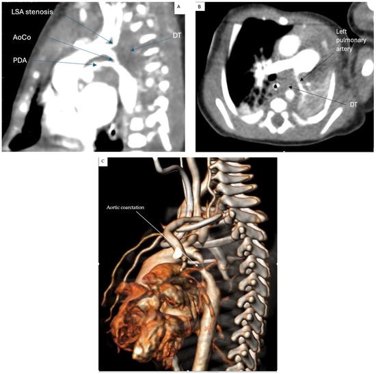 Mediastinal DTs located at the level of the mediastinum is a rare finding, especially in the pediatric population [3,4,5]. Anterior chest wall localization is the most frequently reported [3,4] in pediatric patients, and only five cases have been observed with true intrathoracic DTs in this population [5]. There are no reports of a mediastinal DT resulting in aortic coarctation and left main bronchus stenosis in children and there have been no DTs described in newborns.