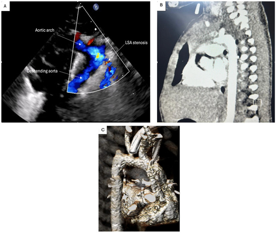 Due to the marked initial hemodynamic instability, a decision was made to perform a patch enlargement angioplasty for the correction of the aortic coarctation, adopting a watchful waiting approach regarding the subclavian artery stenosis. A potential reimplantation of the subclavian artery would have prolonged the operative time and the duration of aortic clamping, thereby increasing the risks associated with the severe preoperative left ventricular dysfunction. Furthermore, the conservative approach that we took with regards to the subclavian artery was also based on the absence of clinical signs of hypoperfusion in the left upper limb. Pericardial patch angioplasty offers several advantages as a treatment for aortic coarctation. This technique provides a durable and anatomically precise repair, minimizing the risk of restenosis compared to other methods. It allows for tailored reconstruction of the aortic arch, particularly in cases with complex anatomies or associated hypoplasia. Furthermore, the use of autologous or bovine pericardium reduces the likelihood of graft rejection and enhances its biocompatibility. This approach also preserves the vascular integrity, avoids the need for prosthetic materials, and facilitates better long-term outcomes, including improved hemodynamic stability and reduced procedural complications.