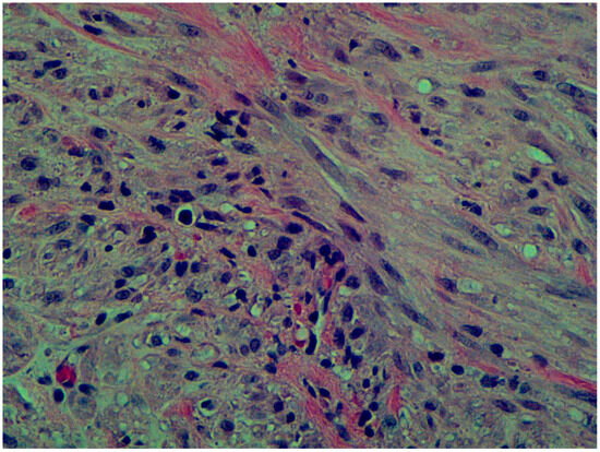 The anatomopathological examination raised suspicion of a desmoid tumor, with the final diagnosis being infantile myofibromatosis (Figure 5). Although the mediastinal tumor was benign, considering its compressive effect on adjacent structures, the decision was made, in collaboration with the pediatric oncology team, to initiate “low-dose” chemotherapy with vinblastine (6 mg/m2 or 0.2 mg/kg/dose) and methotrexate (30 mg/m2 or 1 mg/kg/dose). The patient received weekly cycles of chemotherapy (20 cycles completed) and exhibited good hematological tolerance.