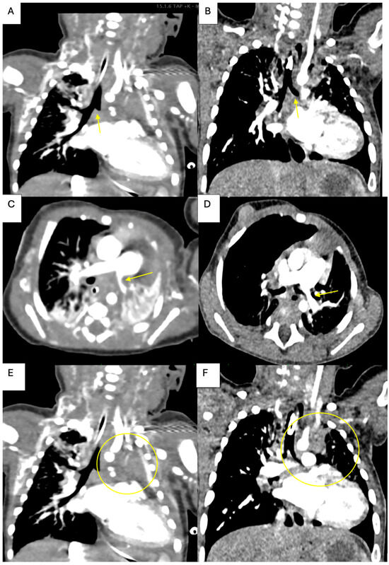 The complete blood count, coagulation tests, and blood biochemistry were within normal limits except for high NTPBNP (69,905 pg/mL) and troponin levels (148 ng/L). The patient’s condition deteriorated rapidly, becoming hypotensive together with worsening respiratory dysfunction (SpO2 below 80% and hypercapnia), oliguria, and acidosis. Inotropic support was initiated with dopamine, PGE1 was continued because of the ductal-dependent circulation, and the initially non-invasive ventilation (MCV) for the management of the respiratory dysfunction was converted to nasotracheal intubation and mechanical ventilation. An emergency thoracic angio-CT was performed, revealing a space-occupying lesion in the superior mediastinum, encasing vascular structures at this level and the left main bronchus. The findings included severe aortic coarctation with a patent ductus arteriosus (PDA), proximal severe stenosis of the left subclavian artery with post-stenotic dilation, and a smaller left pulmonary artery. Additionally, the left lung was hypoplastic, and the tumor mass invaded the left main bronchus, causing severe obstruction (Figure 3). The patient was transferred to the surgical theatre for emergency surgery. We believed that surgical treatment offered more advantages compared to interventional therapy. First, given that the aortic coarctation was caused by tumor invasion/compression, balloon angioplasty would have been a suboptimal method due to the potential for tumor progression over time. Additionally, through tumor excision, we aimed to address both the correction of the aortic coarctation and the severe stenosis of the left main bronchus. Moreover, this strategy provided essential data on the tumor’s histopathology, which is crucial for subsequent oncological management.