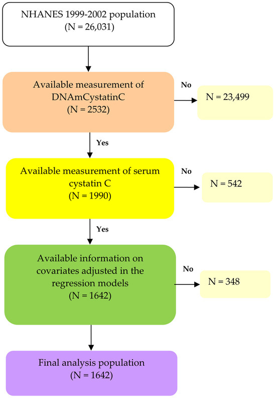The National Health and Nutrition Examination Survey (NHANES) is conducted every two years to provide a comprehensive, nationally representative snapshot of the non-institutionalized civilian population in the United States. Utilizing a complex, multistage probability sampling design, NHANES ensures that its results accurately reflect the broader U.S. population. The dataset used in this study is publicly accessible and de-identified, adhering to strict privacy and ethical guidelines established by the Centers for Disease Control and Prevention. Researchers worldwide can access and analyze NHANES data under the established data usage agreement. Detailed descriptions of the survey’s protocols and consent procedures can be found on the NHANES website [19]. This study utilized data from the 1999–2002 NHANES cycle, which initially included 26,031 participants. Of these, DNAmCystatinC measurements were available for 2532 individuals, and serum cystatin C levels were recorded for 1990 of them. After applying eligibility criteria based on covariates, 1642 participants were included in the final multiple regression analysis. The selection flow is outlined in Figure 1.