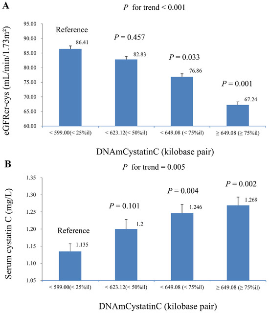 Geometric mean (S.E.) of eGFRcr-cys and serum cystatin C across quartiles of DNAmCystatinC in complex samples of multiple linear regression models, with results weighted for sampling strategy. (A) eGFRcr-cys (adjusted for model 2). (B) serum cystatin C (adjusted for model 3).