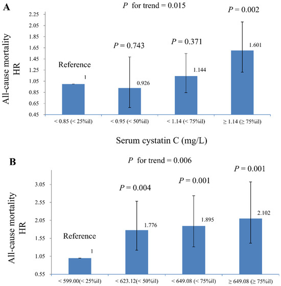 HR (95% CI) for all-cause mortality across quartiles of serum cystatin C and DNAmCystatinC in complex samples of Cox regression model (adjusted for model 3), with results weighted for sampling strategy. (A) Serum cystatin C. (B) DNAmCystatinC.