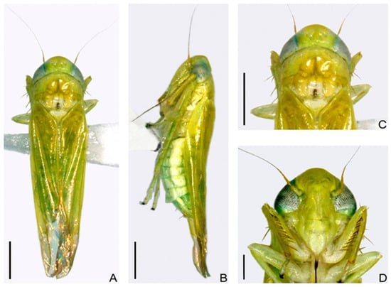 An image of the E. onukii (Hemiptera: Cicadellidae) Matsuda [1]. (A) Male adult, dorsal view. (B) Female adult, left lateral view. (C) Head and thorax, dorsal view. (D) Face. Scale bars: (A–C) = 0.5 mm; (D) = 0.2 mm.