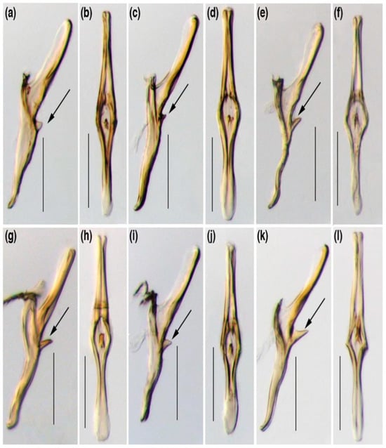 Morphological variations of aedeagus of E. onukii from different tea production regions of Yunnan Province. (a) Chuxiong (CX) population, aedeagus; (b) Chuxiong (CX) population; (c) Pu′er (PE) population; (d) Pu′er (PE) population; (e) Mojiang (MJ) population; (f) Mojiang (MJ) population; (g) Lincang (LX) population; (h) Lincang (LX) population; (i) Jingdong (JD) population; (j) Jingdong (JD) population; (k) Menghai (MH) population; (l) Menghai (MH) population. (a,c,e,g,i,k) aedeagus, left lateral view; (b,d,f,h–j) aedeagus, ventral view. Scale bars: (a–l) = 0.1 mm. Arrows display variations in the shape of the dorsal membranous flanges and the length of ventro-basal spiny protuberances of the aedeagal shaft [33].