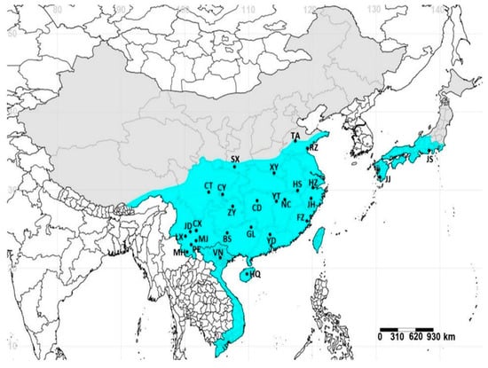 Although previous studies conducted by the authors of [1,3,28,32] described both Taiwan, Japan, and mainland China as a single species, recent comparative morphological studies indicated significant intraspecific variation among populations, with individuals from various southern Chinese populations differing in the shape of their membranous flanges and the length of spiny protrusions on the shaft of the male aedeagus [1,32,33] (Figure 2).