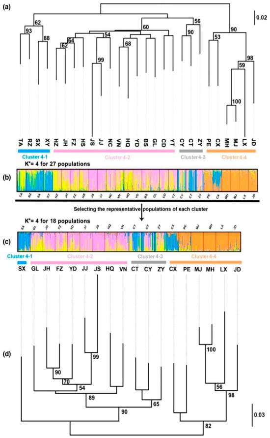 Bayesian clustering results and neighbor-joining (NJ) tree of E. onukii populations based on 18 microsatellite markers. Numbers on nodes represent bootstrap support values (values < 50% not shown). The colors indicate the major clusters inferred by Bayesian clustering analysis when K = 4, except in Clusters 4–3 where mixed genetic components are indicated by gray. Asterisks represent the optimal K = 4. (a,d): NJ tree for 27 populations and 18 populations; (b,c): Bayesian clustering results for 27 populations and 18 populations [33].
