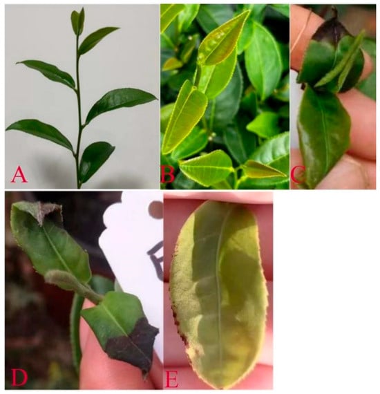 Moreover, the continuous feeding by E. onukii can lead to visible damage on the tea leaves, manifesting as necrosis (tissue death) and chlorosis (yellowing), as highlighted by [70,81]. Such damage not only reduces tea production but also lowers photosynthetic efficiency and overall plant vigor. According to the authors of [76], the feeding activity of E. onukii disrupts the plant’s internal nutrient distribution, which is critical for healthy growth and the proper development of new shoots—both essential for producing high-quality tea (Figure 6).