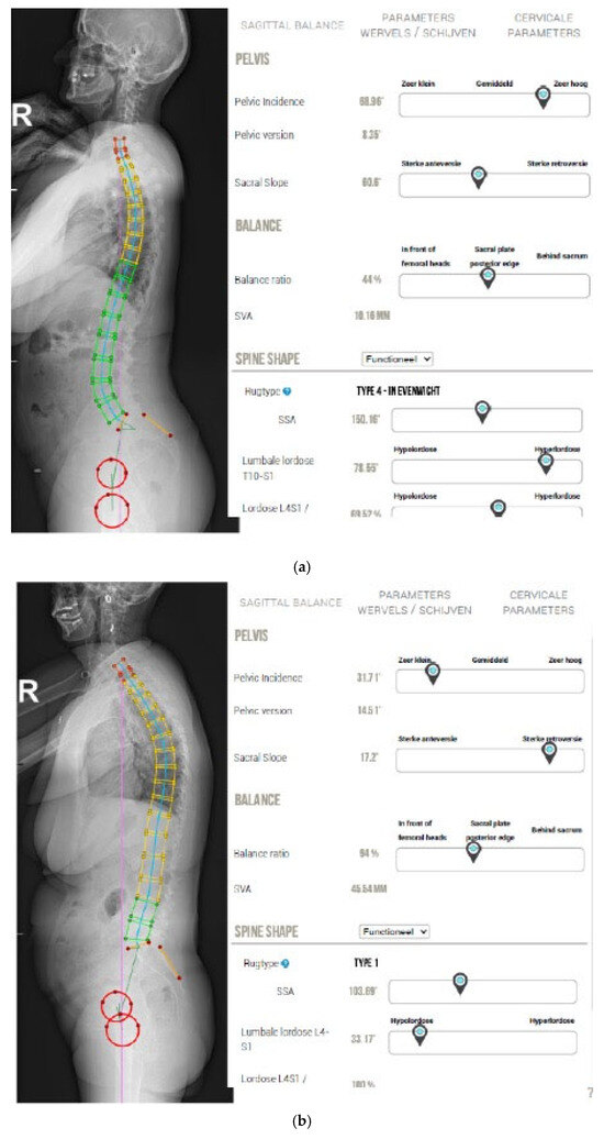 - Roussouly, P.; Pinheiro-Franco, J.L. Biomechanical analysis of the spino-pelvic organization and adaptation in pathology. Eur. Spine J. 2011, 20 (Suppl. 5), 609–618. [Google Scholar] [CrossRef] [PubMed]