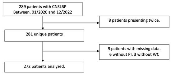 During the observation period (01/2020–12/2022), 289 patients with CNSLBP presented at the neurosurgery outpatient clinic in Vitaz Hospital, St-Niklaas, Belgium. After the elimination of double inclusions and patients with missing data, data from 272 patients were analyzed (See patient flow in Figure 3).