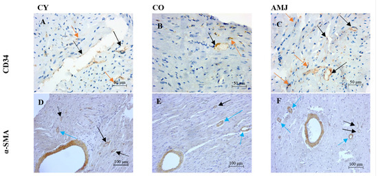 Rat myocardium. (A–C): CD34 immunoexpression (magn. ×200, scale bar = 50 µm) in capillaries (black arrow) and CD34+ cells (orange arrow); (D–F): α-SMA immunoexpression (magn. ×100, scale bar = 100 µm) in capillaries (black arrow) and small-caliber blood vessels (blue arrow).