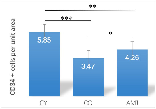CD34 + cells per unit area. *** p < 0.001, ** p < 0.01, and * p < 0.05.