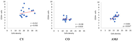 The analysis of the data in relation to the number of CD34+ cells and the total number of cells per unit area reveals a weak positive correlation in the CY group (r = 0.212, p = 0.430) and a very weak negative correlation in the CO group (r= −0.138, p = 0.610). However, in both cases, the low values and their statistical insignificance reveal a disproportionate and non-random distribution of CD34+ cells (Figure 3). In the AMJ group, there was a high positive correlation between the number of CD34+ cells per unit area versus the mean number of cells per area (r = 0.601, p = 0.014) (Figure 3).