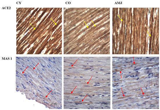 Rat myocardium. ACE2 immunoexpression in cardiomyocytes (yellow arrows), (magn. ×400, scale bar = 25 µm) and MAS 1 immunoexpression in cardiomyocytes (red arrows), (magn. ×400, scale bar = 25 µm).