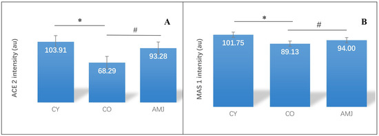 Rat myocardium. (A) ACE2 immunoexpression intensity: * p < 0.05; # p < 0.05; (B) MAS 1 immunoexpression intensity: * p < 0.05; # p < 0.05.