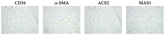 Negative controls of the CD34, α-SMA, ACE2, and MAS1 receptor by the omitting of primary antibodies in the tissue sample. The magnification for all images is ×200.