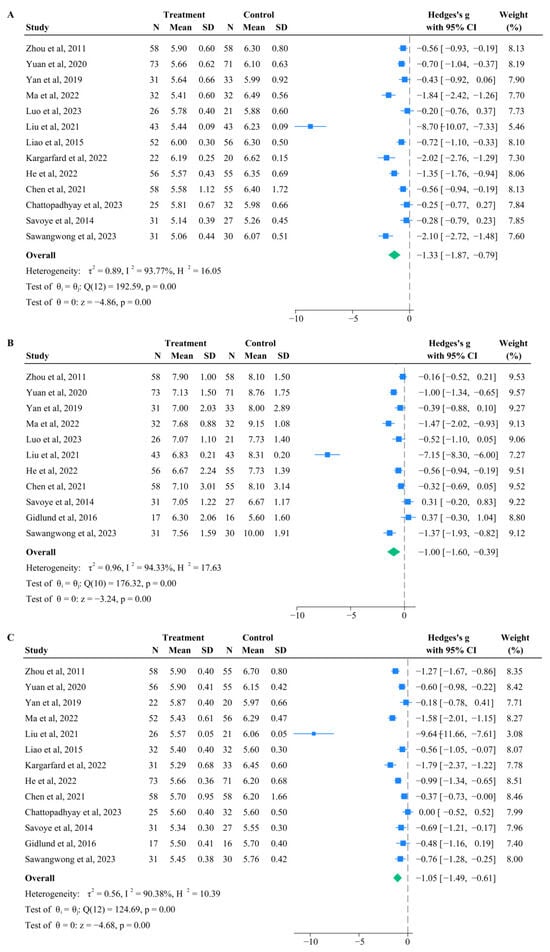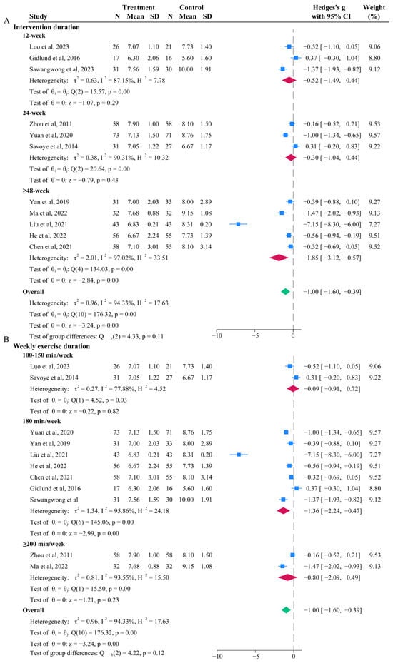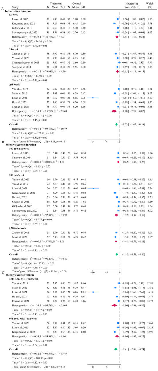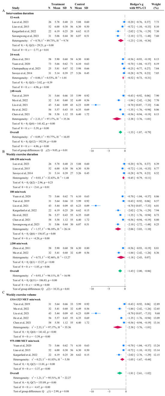 | Liao et al., 2015 [28] | 60 | 42.4 ± 5.8 | 27/33 | Moderate aerobic exercise (jogging or brisk walking) | ≥5 times/week | ≥30 min/day | ≥150 | ≥975 | 12 weeks | moderate intensity | Cyclic |