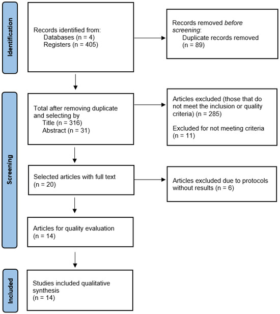 The systematic search yielded 405 results, from which duplicate studies were removed, leaving 316 records for review. After applying the inclusion and exclusion criteria to the full-text documents, 14 articles were included (Figure 1) that addressed the objective of this research.