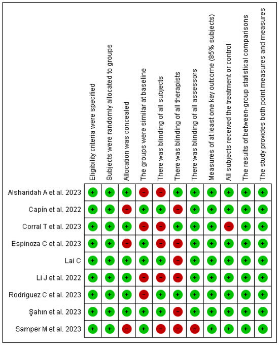 The assessment of the studies’ quality was conducted in a blind and independent manner using both the PEDro [37] and MINOR’S [38] scales. The PEDro scale was used to evaluate the quality of controlled clinical trials, focusing on factors such as participant randomization, allocation concealment, blinding in assessments, and the use of standardized outcome measurement methods. The MINOR’S scale was applied to studies that were not controlled clinical trials, assessing elements such as prospective patient inclusion, sample size calculation, and evaluator blinding.