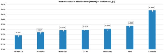 Out of seven evaluated formulas, Hill-RBF 3.0 obtained the lowest RMSAE (0.368), followed by PEARL-DGS (0.374) and Hoffer QST (0.378). In turn, Karmona yielded the highest RMSAE (0.418). The RMSAE outcomes of each formula are listed in Figure 1. The RMSAE statistical comparison was realized utilizing the Bootstrap-t method with the Holm correction. A p-value less than 0.05 was statistically significant and was found only for the Hill-RBF 3.0 vs. Karmona (p = 0.021). Detailed outcomes are presented in Table 3.
