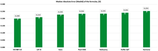 In terms of the MedAE, the best outcomes were achieved by Hill-RBF 3.0 (0.200), LSF AI (0.210), and Kane (0.228), and the worst by Karmona (0.253), as shown in Figure 2.
