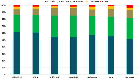 The highest percentage of patients with PEs within ±0.50 D was found for Hill-RBF 3.0 (86.45%), followed by LSF AI (85.51%) and PEARL-DGS (85.05%). Karmona, on the other hand, gained the smallest percentage of patients with PEs within ±0.50 D (81.31%), as shown in Figure 3. However, multiple comparisons of the formulas according to the Cochran Q test with the McNemar post hoc paired test did not find statistical significance (p > 0.271).