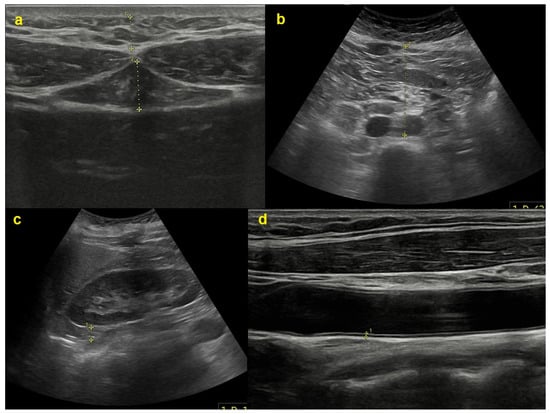 Sonographic measures were acquired by a radiologist utilizing an ultrasound device (Samsung Medison V8; Samsung Healthcare, Seoul, Republic of Korea). A 3.5 MHz curved-array probe was employed to assess adipose tissue parameters ’a’, ’b’, ’c’, and ’d’ (Figure 1), as detailed below: a—thickness of subcutaneous adipose tissue at the xiphoid level; b—thickness of preperitoneal adipose tissue at the xiphoid level; c—distance between the posterior wall of the aorta and the internal surface of the rectus abdominis muscle at the level of the umbilicus (aorta VAT); and d—thickness of right posterior perirenal adipose tissue (perirenal VAT) []. Parameters ’c’ and ’d’ pertain to VAT.