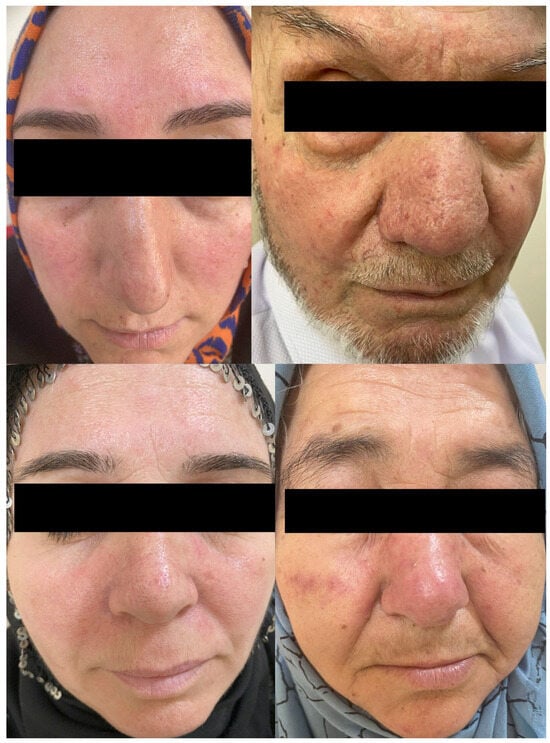 Rosacea is a chronic inflammatory skin condition characterized by episodic flushing followed by persistent central erythema, telangiectasias, red papules, and pustules, and in some cases, phymatous or granulomatous changes. Ocular symptoms can also be associated with the condition. Rosacea predominantly affects fair-skinned women over the age of thirty []. Although numerous studies have been conducted on the etiopathogenesis of rosacea, genetic predisposition, neurovascular dysregulation, activation of the innate immune system, and environmental factors are believed to play significant roles [].