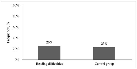 The initial analysis of the complaints related to visual system performance demonstrated that 26% of children with reading difficulties and 23% of children without reading difficulties (the control group) presented with visual complaints (see Figure 1). Statistical analyses demonstrated that both groups presented with similar amounts of visual complaints (Chi-square test of independence: χ2 (1) = 0.063, p = 0.802, Cramer’s V/Phi = 0.802).