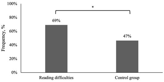 Frequency of significant refractive errors and/or accommodative and binocular dysfunctions in children with reading difficulties and without reading difficulties (the control group). * Statistically significantly difference (Chi-square test of independence p < 0.05).