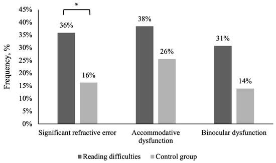Relative frequency of significant refractive errors and accommodative and binocular dysfunctions in children with reading difficulties and without reading difficulties (the control group). * Statistically significantly difference (Chi-square test of independence p < 0.05).