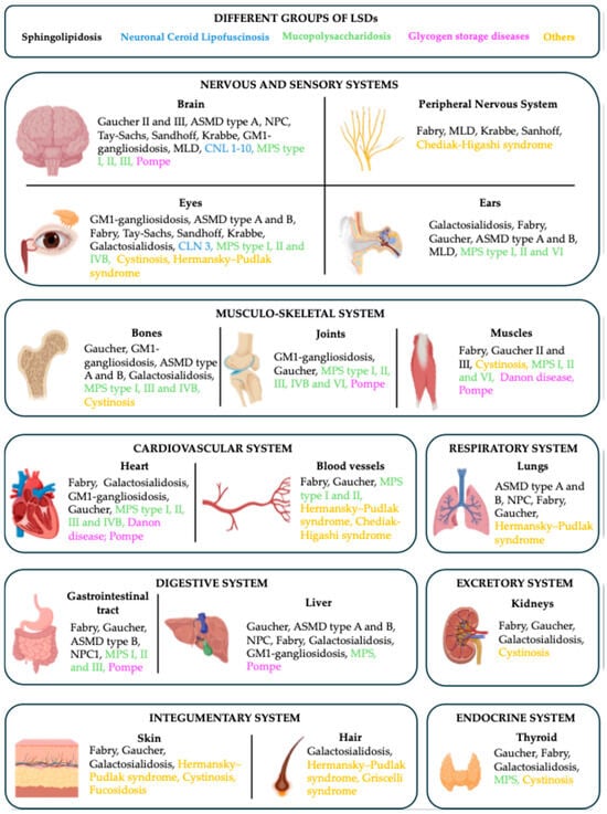 Multisystemic manifestations of lysosomal storage disorders (LSDs). Main disorders showing manifestations in various organs and tissues are indicated. The image does not aim to list all the manifestations of all the diseases, but instead, give an idea of the multisystemic nature of the LSDs.