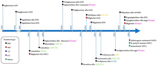Timeline for the approval of LSD-specific therapies. For the sake of clarity, stem cell transplantation has not been included. Therapies: ERT—enzyme replacement therapy; SRT—substrate reduction therapy; CT—chaperone therapy; GT—gene therapy. Diseases: GD—Gaucher disease; FD—Fabry disease; MPS—mucopolysaccharidosis; NPC—Niemann–Pick type C; LAL-D—lysosomal acid lipase deficiency; ASMD—acid sphingomyelinase deficiency; CLN2; AM—alpha mannosidosis; MLD—metachromatic leukodystrophy. For the sake of clarity, stem cell transplantation has not been included in the scheme.