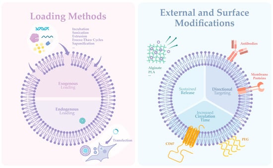 In contraposition to natural EVs, engineered EVs are EVs that have been modified to carry specific bioactive molecules and/or to include targeting moieties that enhance their therapeutic potential. These modifications may also aim to extend their circulation time or enable the sustained release of therapeutic agents (Figure 3) [8,9,55,79].