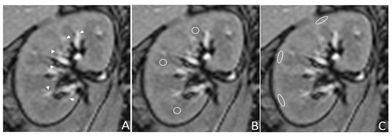T2* mapping images were analyzed by reader 1 (CHL, 1-year experience in abdominal MRI), supervised by reader 2 (WCL, 18-year experience), using a commercially available workstation (Advantage Workstation Volume Share 7, GE Healthcare, Milwaukee, WI, USA). R2* values were measured in six 0.2–0.3 cm2 regions of interest and manually placed in each kidney’s cortex and medulla near or at the hilar level at the upper, mid, and lower poles, avoiding vessels, artifacts, and focal lesions. The medulla was recognized as the renal parenchyma between the two adjacent interlobular vessels, and the cortex was the area adjacent to the kidney’s border (Figure 1). If the corticomedullary differentiation was poor, the cortex was defined within 2 mm of the renal border [21].