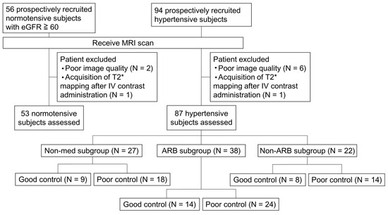 One hundred and fifty consecutive subjects were enrolled, with 56 in the normotensive group and 94 in the hypertensive group. All subjects underwent an MRI exam, but three subjects in the normotensive group and seven subjects in the hypertensive group were excluded due to poor MRI quality caused by motion or susceptibility artifact (N = 8) and or T2* mapping acquired after intravenous contrast administration (N = 2). The flow chart is shown in Figure 2.