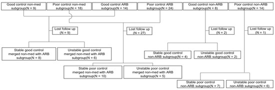 In the good control non-med, ARB, and non-ARB subgroups, 6, 3, and 2 subjects were lost to follow-up, respectively. In the poor control groups, 15, 12, and 1 subjects were lost to follow-up. The merged non-med with ARB good control subgroup had 14 subjects: 8 stable and 6 unstable. The merged non-med with ARB poor control subgroup had 15 subjects: 10 stable and 5 unstable. Overall, 18 subjects were in the stable subgroup, and 11 were in the unstable subgroup of the merged non-med with ARB subgroup. In the good control, non-ARB subgroup, 4 subjects remained stable, but 2 subjects became unstable. In the poor control non-ARB subgroup, 7 subjects were in the stable subgroup, and 6 were in the unstable subgroup. In total, 11 subjects were in the stable subgroup, and 8 were in the unstable group of the non-ARB subgroup. Finally, 29 were in the stable subgroup, and 19 were in the unstable subgroup of all followed subjects. The flow chart is shown in Figure 3.
