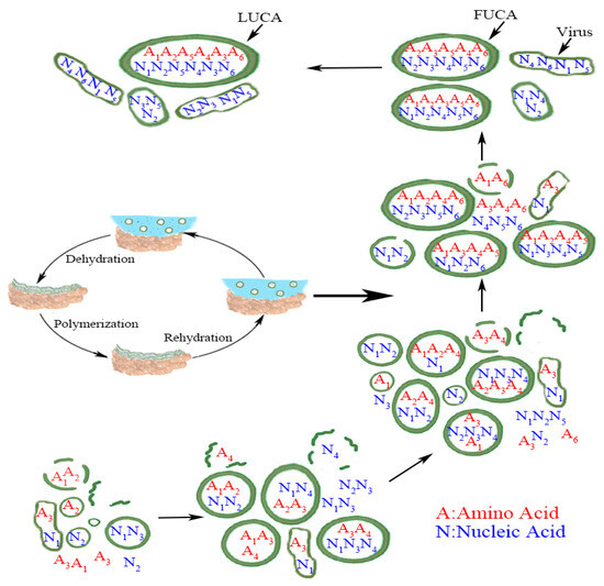 From vesicles to LUCA (reproduced from [5] with permission.) Numbers in subscript denote different amino acids and nucleic acids. The exact matching between amino acid and nucleic acid within LUCA, in a metaphorical sense, implies that the standard genetic code (SGC) had evolved most completely by the time of LUCA. The less than exact matching amino acid and nucleic acid within FUCA and vesicles before FUCA denotes the evolutionary path of SGC from a rudimentary form to a mature form in LUCA. The wet-and-dry cycle part within the figure is adapted from [7] with their kind permission. Figure 1 retains virus to make the whole picture complete, but we do not simulate the evolution of virus here. Credit: author.