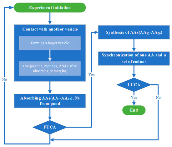 First, we are mostly interested in simulating the hypothesis that FUCAs and LUCA had most likely evolved by drawing from “global innovation” via vesicles’ merger and acquisition [5,15,16,17,22]. As such, we do not simulate the chemical synthesis of polymers from nucleotides or amino acids [23,24], the evolution of autocatalytic cycles, the evolution of an RNA self-replication system [25,26,27], the formation of an RNA–peptide world [28,29,30], the forming of vesicles [18,19,20], the division of vesicles driven by absorption of ingredients from the environment or merging with other vesicles [9], the coupling of an RNA replication system to vesicles [31], or the coupling of cellularity to metabolism [21,32,33], partly because they have been performed earlier, either via simulation or via wet experiments. Also, simulating the whole process from chemical evolution to the coming of LUCA will be a daunting, if not an impossible, task, without necessarily shedding much light on the central mechanism we highlight here (for instance, Yin et al. [31] simulated how an RNA replication system can evolve and then spread, and their “cellular” evolution is really about vesicles engulfing an RNA replication system). Thus, their simulation does not deal with the evolution of LUCA, or even the evolution of FUCAs. Our simulation (based on our theory) subsumes vesicles engulfing ingredients such as amino acids, nucleotides, peptides, and RNAs. Most critically, Yin et al. [31] based their simulation on the “hydrothermal vent” scenario, which many others and we believe to be rather unrealistic [5,6,7,8]). We therefore focus on the late stage of the evolution of LUCA, somewhat similar to Takagi et al. [21] and Nunes Palmeira et al. [32].