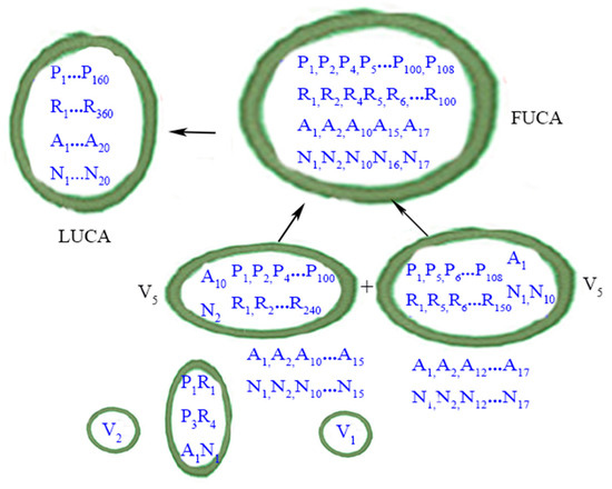 From FUCAs to LUCA. P: peptide; R: RNAs. A: amino acid; N: nucleotide (as codons). Protocells or vesicles are in closed circles. LUCA is depicted according to the definition in the main text. The perfect matching of amino acids (A) and nucleic acids (N) within LUCA, in a metaphorical sense, implies that the standard genetic code (SGC) had evolved most completely by the time of LUCA. The less than exact matching of amino acids and nucleic acids within the one FUCA and the two V5 vesicles denotes the evolutionary path of SGC from a rudimentary form to a mature form in LUCA. Contents within the two smaller vesicles (i.e., V1 and V2) are now shown. The wet-and-dry cycle part is omitted here. Credit: author.