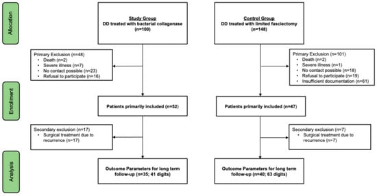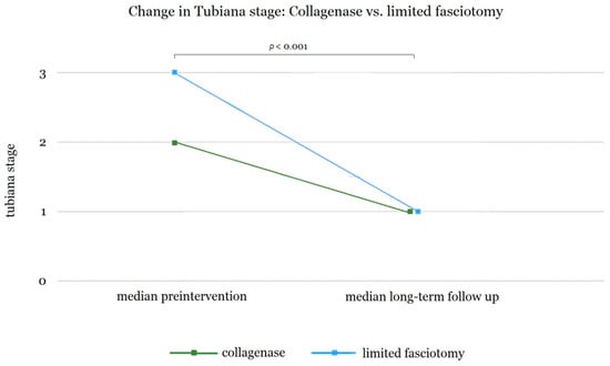 Chicago/Turabian StyleWachtel, Nikolaus, Francesca Romana Dingler, Constanze Kuhlmann, Sinan Mert, Elisabeth Maria Haas-Lützenberger, Verena Alt, Nicholas Moellhoff, Riccardo Giunta, and Wolfram Demmer. 2025. "Therapy for Dupuytren’s Disease (II): Collagenase Therapy vs. Limited Fasciectomy—A Long-Term Comparative Study" Life 15, no. 1: 76. https://doi.org/10.3390/life15010076