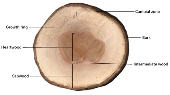 Wood is comprised predominantly of secondary xylem, a vital tissue that fulfills the dual role of providing mechanical support and facilitating water conduction [1]. The production of secondary xylem is attributed to the activity of the cambial zone, a lateral meristem situated between the primary xylem and phloem. The cambial zone is responsible for the diameter growth of tree axes, both in the shoot and the root, through its continuous cell division and subsequent differentiation. Newly formed cells are attached to the outer layer of the primary xylem. This contributes to the radial expansion [2]. As the cambial zone expands outward, secondary xylem undergoes expansion and thickening, resulting in an augmentation of stem diameter [3]. Sapwood (SW) is adjacent to the inside of the cambial zone, while the heartwood (HW) is adjacent to the inside of the sapwood. And the intermediate wood is present between the heartwood and sapwood. They can usually be identified in tree disc by their respective colors [4,5] (Figure 1). The sapwood, characterized by its lighter color and greater porosity, contrasts with the heartwood, which is darker in color and more compact in structure [1,6]. The intermediate wood acts as a transition zone (TZ) between the middle sapwood and the heartwood. In some instances, the TZ can be distinguished by its white color. This phenomenon occurs when water loss occurs in the intermediate wood region during heartwood formation [7].