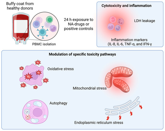 Experimental design of the study; created in BioRender. https://BioRender.com/s74d404 (accessed on 14 December 2024). PBMC: peripheral blood mononuclear cells; NA-drugs: nucleic-acid drugs; LDH: lactate dehydrogenase; IL: interleukin; TNF: tumor necrosis factor; IFN: interferon.