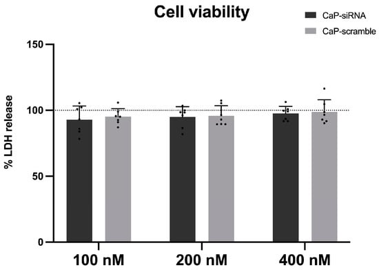 The results obtained (Figure 2) indicate no cytotoxic effects induced by CaP-siRNA and CaP-scramble at all the concentrations tested, compared to the control (CaP NPs), which were previously proved to be non-cytotoxic [30,31].