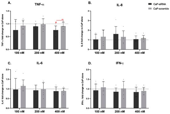 No changes in IL-8, IL-6, and IFN-γ releases were observed after CaP-siRNA or, CaP-scramble (Figure 3B–D). TNF-α levels were statistically significantly reduced after 24 h (Figure 3A) in CaP-siRNA treated cells at the concentration of 400 nM compared to both non-loaded CaP NPs (#) and CaP-scramble (**) groups.