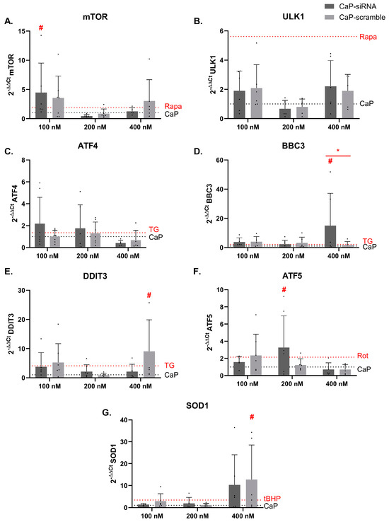 The activation of the toxicity pathways was analyzed by RT-PCR following 24 h of treatments with the CaP-siRNA, CaP-scramble, and non-loaded CaP NPs at the concentrations 100, 200, and 400 nM, and positive controls. The results shown in Figure 4 are related to modulation of the mRNA levels of genes involved in autophagy (A) mTOR and (B) ULK1; ER stress (C) ATF4, (D) BBC3, and (E) DDIT3; mitochondrial stress (F) ATF5; and oxidative stress (G) SOD1.