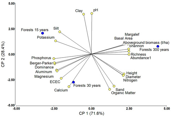 Regarding the environmental, structural, and ecological factors affecting the AB in all studied forests, AB was significantly determined by the type of ecosystem, average diameter, species richness, abundance of individuals, and the Shannon and Margalef indices (F test = 12.94; p-value < 0.001). In this analysis, the variables explained 38.1% of the variation in the AB (Table 3). In primary forests only (Pacurita and Opogodó), the AB was significantly positively influenced by the average tree height and species richness, and negatively influenced by dominance and Shannon’s equity (F test = 24.45; p-value < 0.001). In this analysis, the variables explained 44.49% of the variation in the AB (Table 4). Finally, in areas previously degraded by mining, AB was significantly related to species richness and Shannon’s diversity index, and negatively related to the Margalef index and the percentage of soil silt (F test = 10.77; p-value < 0.001). In this analysis, the variables explained 54.2% of the variation in the AB (Table 5). The results of the general linear model (GLM) showed that the interaction of variables such as successional stage*nitrogen (F test = 4.27; p-value = 0.0411), successional stage*organic matter (F test = 5.97; p-value = 0.0161), successional stage*phosphorus (F test = 3.48; p-value = 0.064), successional stage*organic matter*richness (F test = 4.65; p-value = 0.033), and successional stage*dominance (F test = 5.21; p-value = 0.024) significantly influenced aboveground biomass (Table S1 in the Supplementary Materials). The PCA results showed that the AB, Margalef index, Shannon index, species richness, basal area, abundance of individuals, tree height, and tree diameter, as well as nitrogen, organic matter, and sand contents were collinearly related (Figure 2). The PCA results showed that the Simpson and Berger–Parker indices, as well as phosphorus, potassium, aluminum, magnesium, calcium, and silt contents, were collinearly related, especially in forests degraded by mining (Figure 2). PC1 and PC2 explained 71.6% and 28.4% of the variation, respectively (Figure 2).