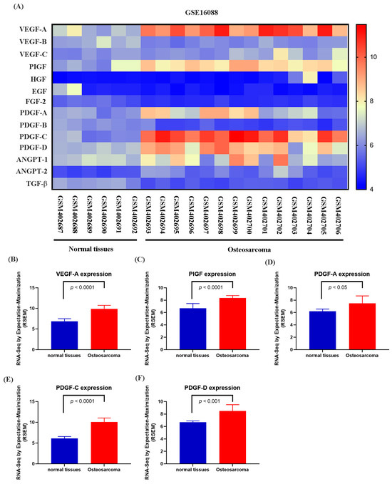 Differential expression of angiogenesis-related genes in osteosarcoma and normal tissues (GSE16088 dataset). (A) Heatmap showing the expression levels of angiogenesis-related genes, including the VEGF family (VEGF-A, VEGF-B, VEGF-C), PlGF, HGF, EGF, FGF-2, PDGF family (PDGF-A, PDGF-B, PDGF-C, PDGF-D), ANGPT family (ANGPT-1, ANGPT-2), and TGF-β, in normal and osteosarcoma tissues from the GSE16088 dataset. Expression values are represented on a color scale, with red indicating higher expression and blue indicating lower expression. (B–F) Differential expression analysis of selected genes between normal and osteosarcoma tissues. Quantitative analysis shows significant upregulation of VEGF-A (B), PlGF (C), PDGF-A (D), PDGF-C (E), and PDGF-D (F) in osteosarcoma tissues compared to normal tissues. Data are presented as mean ± SEM based on RNA-Seq expression values normalized to RPKM.
